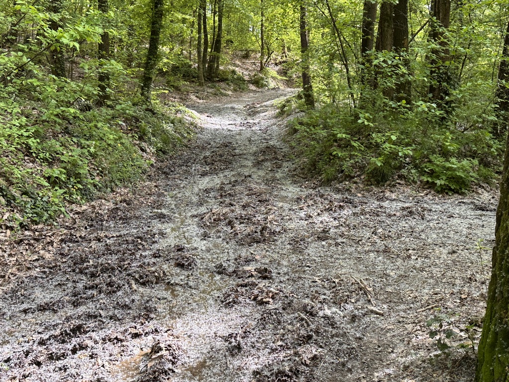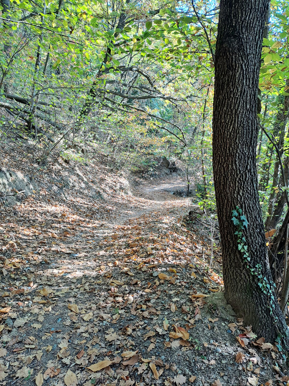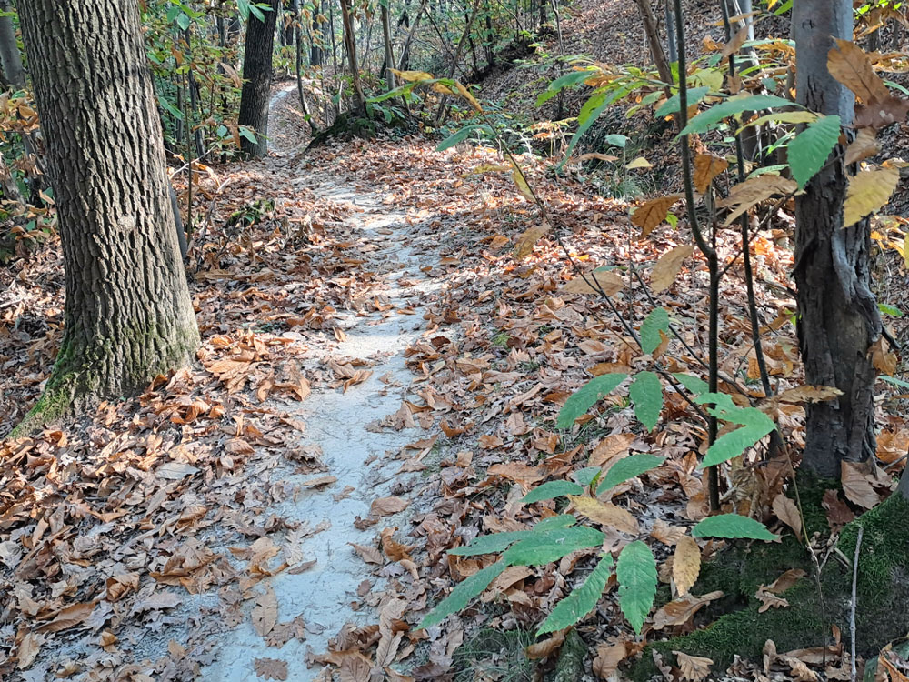 Di qui prosegui sulla strada in direzione dell’Eremo per un breve tratto. Superata la rotonda entra nuovamente nel bosco, seguendo a destra l’antica strada Termo del Forà (o Strà dj Arsete) che, correndo con lievi saliscendi sul confine dei comuni di Pino e di Pecetto, termina sulla strada Val San Martino Superiore.